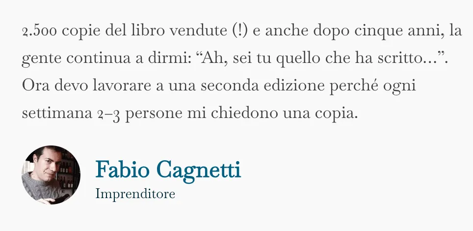 Ma il dato più importante non è il venduto immediato. È la longevità. A distanza di 5 anni, il libro continua a vendere. L’autore viene riconosciuto agli eventi grazie alla copertina del libro.